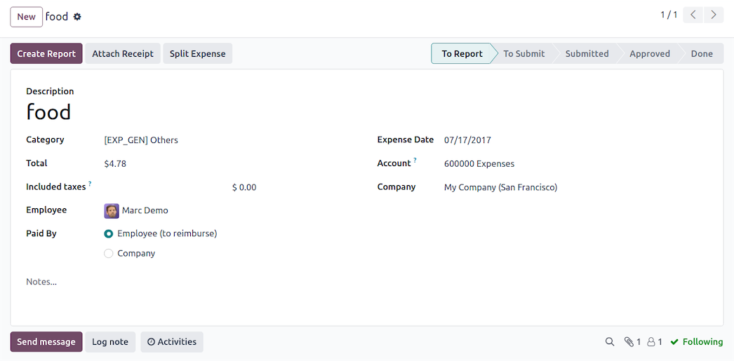 Expense categories are pre-configured! When the Expenses app is installed, a set of pre-loaded expense categories are available so you can start creating expense records right away.