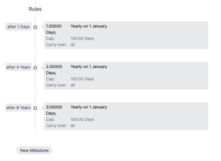 Customize accrual plans to automatically assign additional time to employees when they reach milestones with the company.