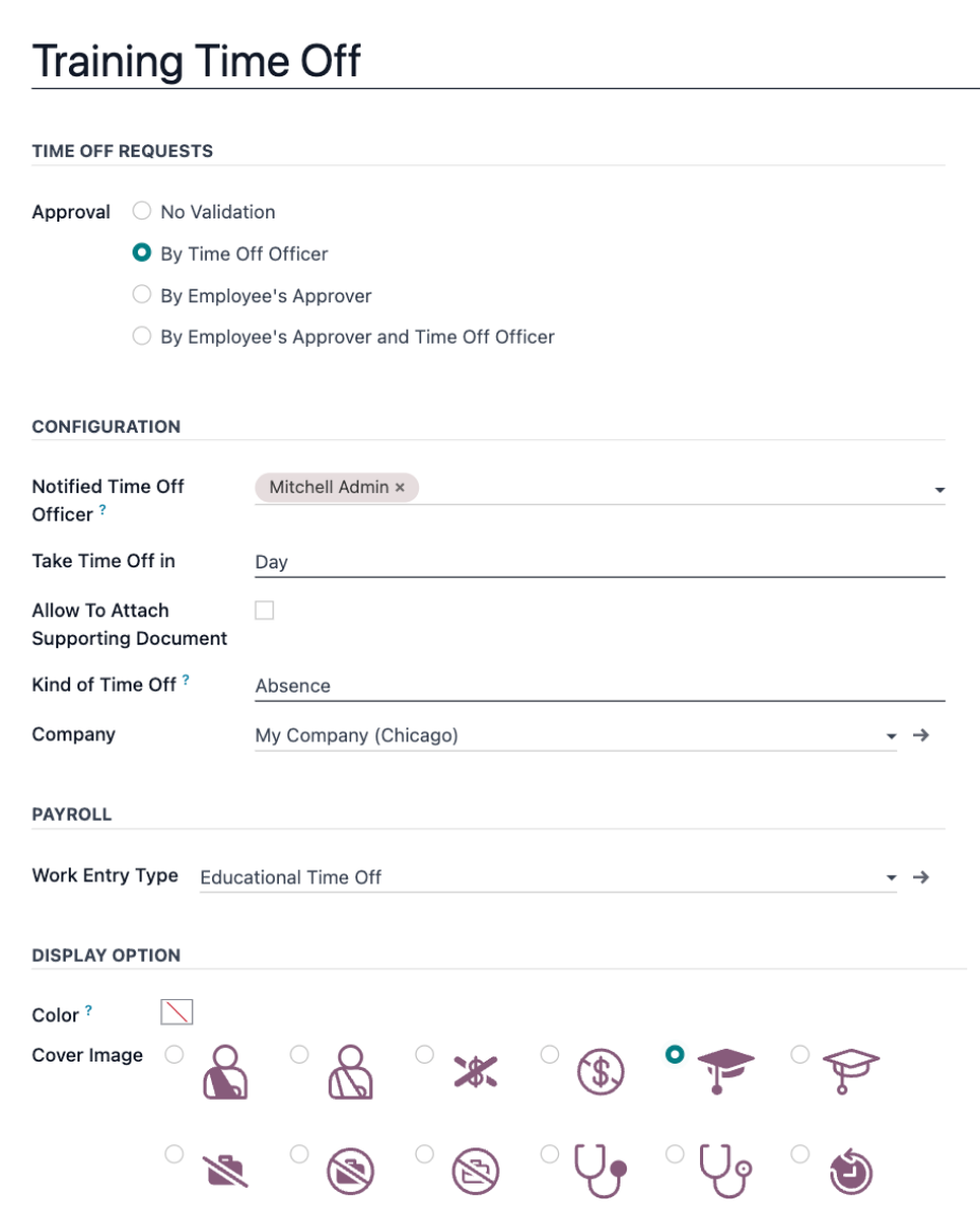 Customize as many time off types as you can think of! Decide on approval and validation settings, configure notifications, and customize display options to keep things organized.