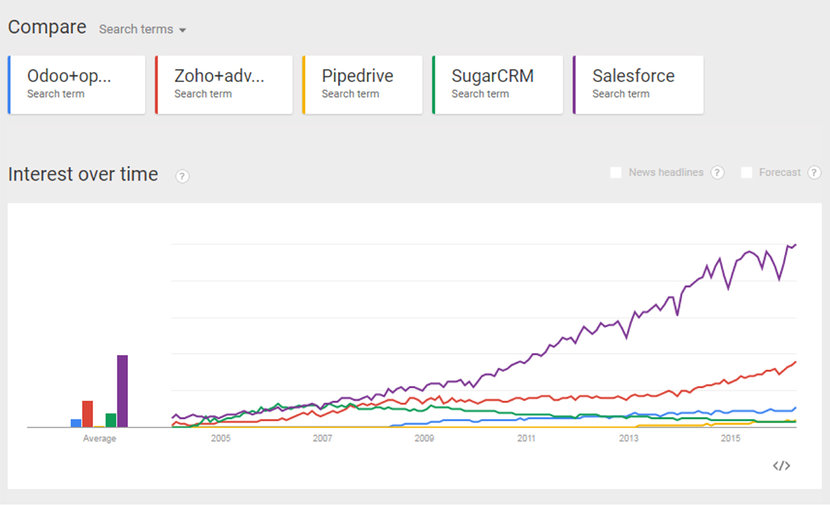 The following graph was created with the Explore tool on Google Trends. The color curves show the number of Google searches for the associated keywords 1. This metric shows the relative consumer interest in each software platform.