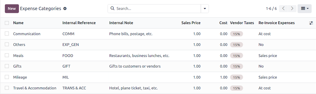 Expense categories are pre-configured! When the Expenses app is installed, a set of pre-loaded expense categories are available so you can start creating expense records right away.