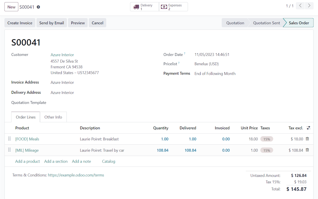 Sales orders are automatically updated once expenses to reinvoice are approved. Employees are reimbursed with just a few clicks, no need to go into the accounting app!